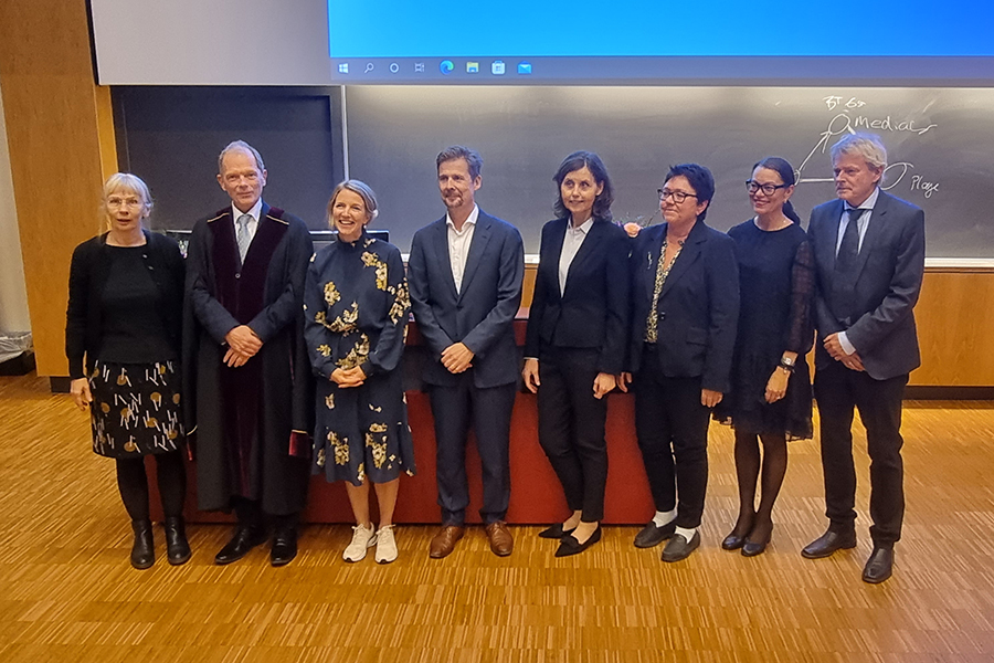 Fra venstre førsteopponent Ellisiv B. Mathiesen, disputasleder Bjørnar Hassel, doktorand Thea Vigen, andreopponent Erik Lundström, leder av bedømmelseskomiteen Mona Skjelland, biveiledere Bente Thommessen, Hege Ihle-Hansen og Kjetil Steine.